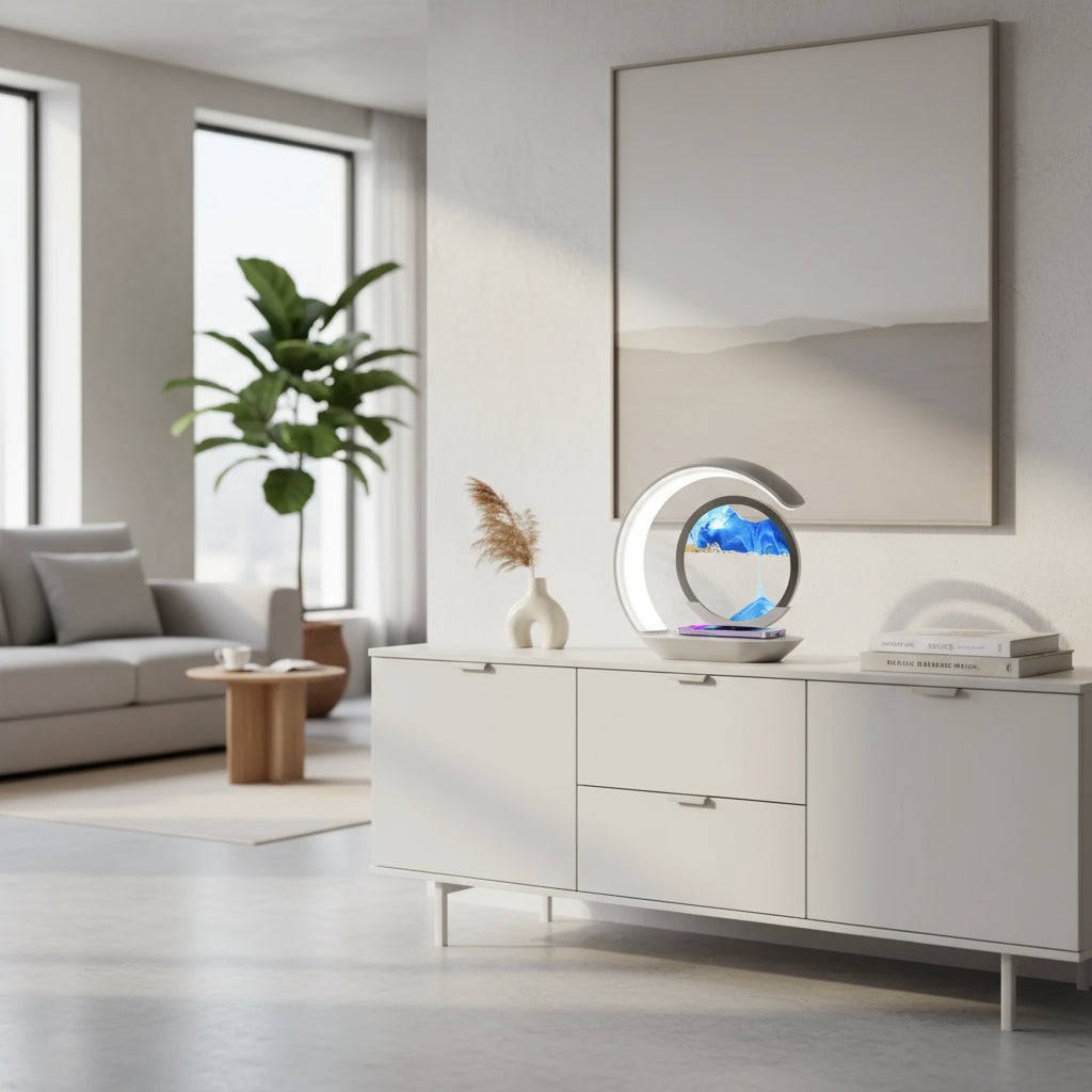 Admirez le ballet hypnotique du sable 3D tout en profitant d'une charge sans fil ultra rapide. Design premium qui sublime votre espace.